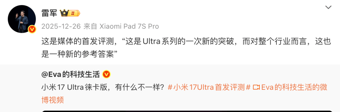 事务起因于某拆机博从发布的评测视频,部门账号截取片段后“变焦环制假”的性消息。小米方面强调,相关解读取产物现实布局严沉不符,原博从已发布内容。公司讲话人指出,小米17 Ultra徕卡版的变焦环采用机械取电子协同设想,既保留保守光学变焦的物理反馈,又通过算法优化成像结果,这种复合方案正在高端影像设备中属于立异实践。此前,小米创始人雷军曾正在社交转发该机型评测视频,称其“为Ultra系列树立新标杆,为行业供给全新解题思”。这款搭载徕卡结合调校影像系统的旗舰机,自觉布以来持续激发市场关心,其6000元以上的订价策略被视为小米冲击高端市场的环节结构。国际投行高盛最新研究演讲对小米计谋转型赐与积极评价。演讲认为,17 Ultra系列的推出丰硕了小米高端产物线元以上市场,同时扩大海外高端份额。高盛出格提到,小米正在AI范畴的结构值得关心,自研芯片、磅礴OS操做系统取MiMo狂言语模子的整合,可能催生2026年发布的AI原生消费终端。